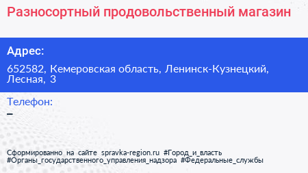 Разносортный, продовольственный магазин по адресу 652582, Кемеровская область, Ленинск-Кузнецкий, Лесная, 3 в дальнейшем Организация, размещена в следующих категориях:
