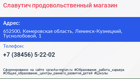 Славутич, продовольственный магазин по адресу 652500, Кемеровская область, Ленинск-Кузнецкий, Туснолобовой, 1 в дальнейшем Организация, размещена в следующих категориях:
