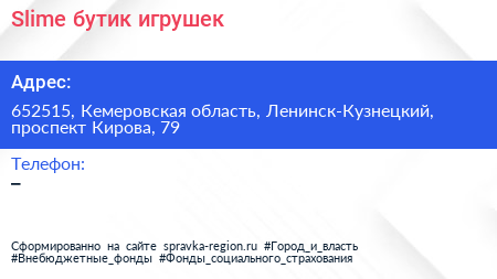 Slime, бутик игрушек по адресу 652515, Кемеровская область, Ленинск-Кузнецкий, проспект Кирова, 79 в дальнейшем Организация, размещена в следующих категориях:
