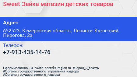 Sweet Зайка, магазин детских товаров по адресу 652523, Кемеровская область, Ленинск-Кузнецкий, Пирогова, 2а в дальнейшем Организация, размещена в следующих категориях: