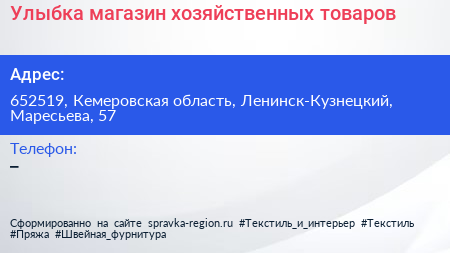 Улыбка, магазин хозяйственных товаров по адресу 652519, Кемеровская область, Ленинск-Кузнецкий, Маресьева, 57 в дальнейшем Организация, размещена в следующих категориях: