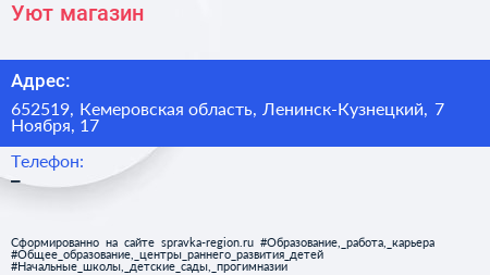 Уют, магазин по адресу 652519, Кемеровская область, Ленинск-Кузнецкий, 7 Ноября, 17 в дальнейшем Организация, размещена в следующих категориях: