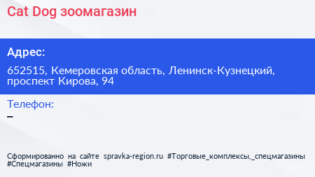 Cat & Dog, зоомагазин по адресу 652515, Кемеровская область, Ленинск-Кузнецкий, проспект Кирова, 94 в дальнейшем Организация, размещена в следующих категориях: