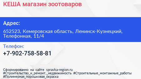 КЕША, магазин зоотоваров по адресу 652523, Кемеровская область, Ленинск-Кузнецкий, Телефонная, 11/4 в дальнейшем Организация, размещена в следующих категориях: