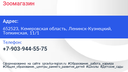Зоомагазин по адресу 652523, Кемеровская область, Ленинск-Кузнецкий, Топкинская, 11/1 в дальнейшем Организация, размещена в следующих категориях: