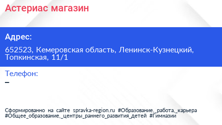 Астериас, магазин по адресу 652523, Кемеровская область, Ленинск-Кузнецкий, Топкинская, 11/1 в дальнейшем Организация, размещена в следующих категориях: