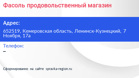 Фасоль, продовольственный магазин по адресу 652519, Кемеровская область, Ленинск-Кузнецкий, 7 Ноября, 17а в дальнейшем Организация, размещена в следующих категориях: