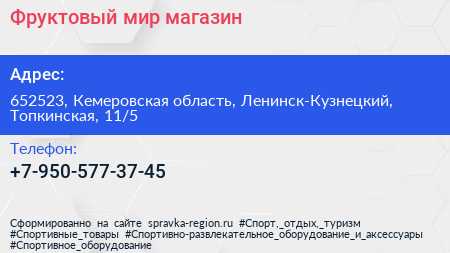 Фруктовый мир, магазин по адресу 652523, Кемеровская область, Ленинск-Кузнецкий, Топкинская, 11/5 в дальнейшем Организация, размещена в следующих категориях: