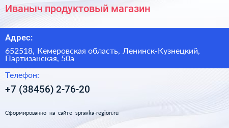 Иваныч, продуктовый магазин по адресу 652518, Кемеровская область, Ленинск-Кузнецкий, Партизанская, 50а в дальнейшем Организация, размещена в следующих категориях: