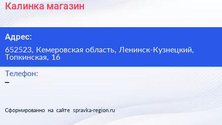 Калинка, магазин по адресу 652523, Кемеровская область, Ленинск-Кузнецкий, Топкинская, 16 в дальнейшем Организация, размещена в следующих категориях: