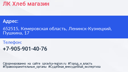ЛК Хлеб, магазин по адресу 652515, Кемеровская область, Ленинск-Кузнецкий, Пушкина, 17 в дальнейшем Организация, размещена в следующих категориях: