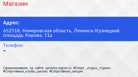 Магазин по адресу 652518, Кемеровская область, Ленинск-Кузнецкий, площадь Кирова, 11а в дальнейшем Организация, размещена в следующих категориях: