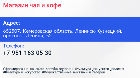 Магазин чая и кофе по адресу 652507, Кемеровская область, Ленинск-Кузнецкий, проспект Ленина, 52 в дальнейшем Организация, размещена в следующих категориях: