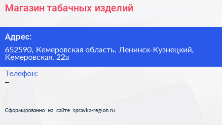 Магазин табачных изделий по адресу 652590, Кемеровская область, Ленинск-Кузнецкий, Кемеровская, 22а в дальнейшем Организация, размещена в следующих категориях: