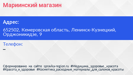Мариинский, магазин по адресу 652502, Кемеровская область, Ленинск-Кузнецкий, Орджоникидзе, 9 в дальнейшем Организация, размещена в следующих категориях: