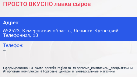 ПРОСТО ВКУСНО, лавка сыров по адресу 652523, Кемеровская область, Ленинск-Кузнецкий, Телефонная, 13 в дальнейшем Организация, размещена в следующих категориях: