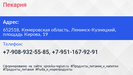 Пекарня по адресу 652518, Кемеровская область, Ленинск-Кузнецкий, площадь Кирова, 19 в дальнейшем Организация, размещена в следующих категориях: