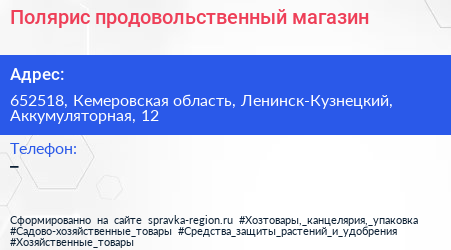Полярис, продовольственный магазин по адресу 652518, Кемеровская область, Ленинск-Кузнецкий, Аккумуляторная, 12 в дальнейшем Организация, размещена в следующих категориях: