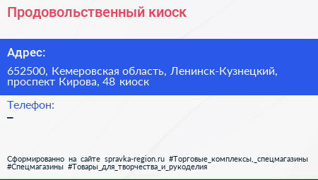 Продовольственный киоск по адресу 652500, Кемеровская область, Ленинск-Кузнецкий, проспект Кирова, 48 киоск в дальнейшем Организация, размещена в следующих категориях: