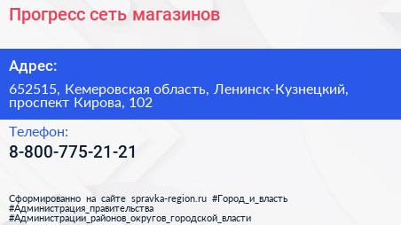 Прогресс, сеть магазинов по адресу 652515, Кемеровская область, Ленинск-Кузнецкий, проспект Кирова, 102 в дальнейшем Организация, размещена в следующих категориях:
