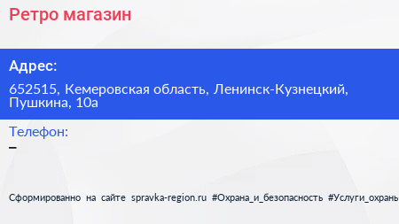 Ретро, магазин по адресу 652515, Кемеровская область, Ленинск-Кузнецкий, Пушкина, 10а в дальнейшем Организация, размещена в следующих категориях: