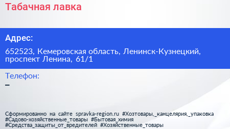 Табачная лавка по адресу 652523, Кемеровская область, Ленинск-Кузнецкий, проспект Ленина, 61/1 в дальнейшем Организация, размещена в следующих категориях: