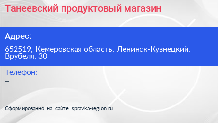 Танеевский, продуктовый магазин по адресу 652519, Кемеровская область, Ленинск-Кузнецкий, Врубеля, 30 в дальнейшем Организация, размещена в следующих категориях: