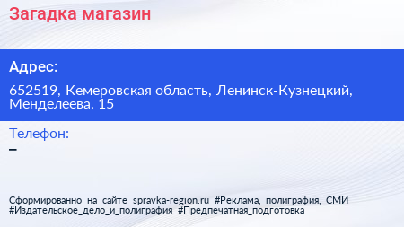 Загадка, магазин по адресу 652519, Кемеровская область, Ленинск-Кузнецкий, Менделеева, 15 в дальнейшем Организация, размещена в следующих категориях: