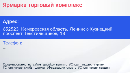Ярмарка, торговый комплекс по адресу 652523, Кемеровская область, Ленинск-Кузнецкий, проспект Текстильщиков, 18 в дальнейшем Организация, размещена в следующих категориях: