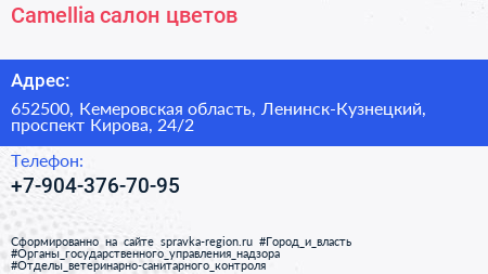 Camellia, салон цветов по адресу 652500, Кемеровская область, Ленинск-Кузнецкий, проспект Кирова, 24/2 в дальнейшем Организация, размещена в следующих категориях: