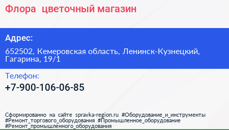 Флора+, цветочный магазин по адресу 652502, Кемеровская область, Ленинск-Кузнецкий, Гагарина, 19/1 в дальнейшем Организация, размещена в следующих категориях: