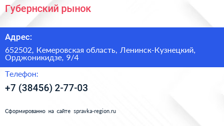 Губернский рынок по адресу 652502, Кемеровская область, Ленинск-Кузнецкий, Орджоникидзе, 9/4 в дальнейшем Организация, размещена в следующих категориях: