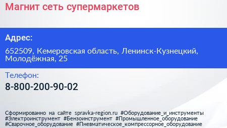 Магнит, сеть супермаркетов по адресу 652509, Кемеровская область, Ленинск-Кузнецкий, Молодёжная, 25 в дальнейшем Организация, размещена в следующих категориях: