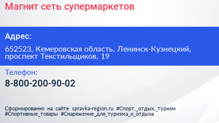 Магнит, сеть супермаркетов по адресу 652523, Кемеровская область, Ленинск-Кузнецкий, проспект Текстильщиков, 19 в дальнейшем Организация, размещена в следующих категориях: