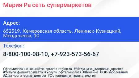 Мария-Ра, сеть супермаркетов по адресу 652519, Кемеровская область, Ленинск-Кузнецкий, Менделеева, 10 в дальнейшем Организация, размещена в следующих категориях: