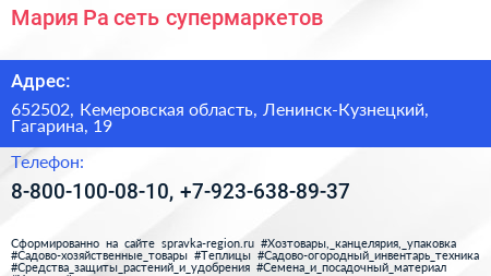 Мария-Ра, сеть супермаркетов по адресу 652502, Кемеровская область, Ленинск-Кузнецкий, Гагарина, 19 в дальнейшем Организация, размещена в следующих категориях: