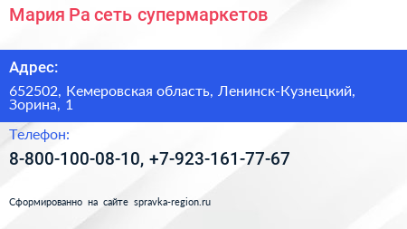 Мария-Ра, сеть супермаркетов по адресу 652502, Кемеровская область, Ленинск-Кузнецкий, Зорина, 1 в дальнейшем Организация, размещена в следующих категориях: