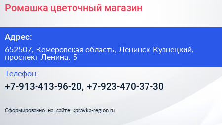 Ромашка, цветочный магазин по адресу 652507, Кемеровская область, Ленинск-Кузнецкий, проспект Ленина, 5 в дальнейшем Организация, размещена в следующих категориях: