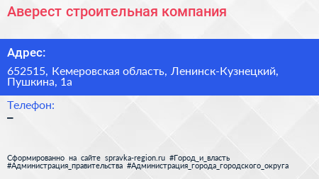 Аверест, строительная компания по адресу 652515, Кемеровская область, Ленинск-Кузнецкий, Пушкина, 1а в дальнейшем Организация, размещена в следующих категориях: