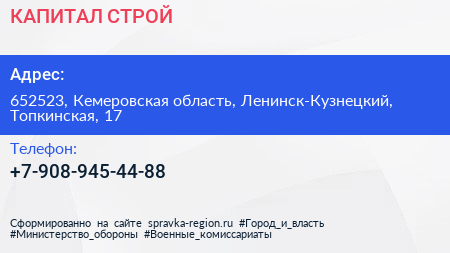 КАПИТАЛ СТРОЙ по адресу 652523, Кемеровская область, Ленинск-Кузнецкий, Топкинская, 17 в дальнейшем Организация, размещена в следующих категориях: