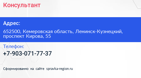 Консультант по адресу 652500, Кемеровская область, Ленинск-Кузнецкий, проспект Кирова, 55 в дальнейшем Организация, размещена в следующих категориях: