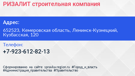 РИЗАЛИТ, строительная компания по адресу 652523, Кемеровская область, Ленинск-Кузнецкий, Кузбасская, 120 в дальнейшем Организация, размещена в следующих категориях: