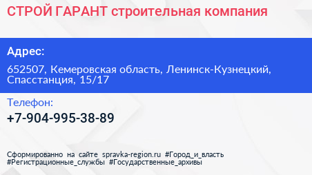 СТРОЙ ГАРАНТ, строительная компания по адресу 652507, Кемеровская область, Ленинск-Кузнецкий, Спасстанция, 15/17 в дальнейшем Организация, размещена в следующих категориях: