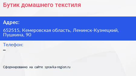 Бутик домашнего текстиля по адресу 652515, Кемеровская область, Ленинск-Кузнецкий, Пушкина, 90 в дальнейшем Организация, размещена в следующих категориях: