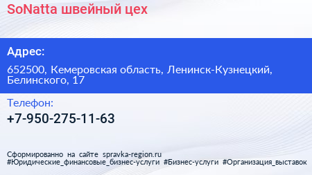 SoNatta, швейный цех по адресу 652500, Кемеровская область, Ленинск-Кузнецкий, Белинского, 17 в дальнейшем Организация, размещена в следующих категориях: