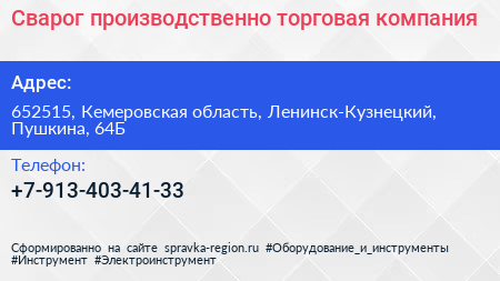 Сварог, производственно-торговая компания по адресу 652515, Кемеровская область, Ленинск-Кузнецкий, Пушкина, 64Б в дальнейшем Организация, размещена в следующих категориях: