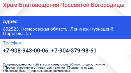 Храм Благовещения Пресвятой Богородицы по адресу 652523, Кемеровская область, Ленинск-Кузнецкий, Пирогова, 5а в дальнейшем Организация, размещена в следующих категориях: