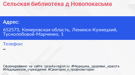 Сельская библиотека, д. Новопокасьма по адресу 652573, Кемеровская область, Ленинск-Кузнецкий, Туснолобовой-Марченко, 1 в дальнейшем Организация, размещена в следующих категориях: