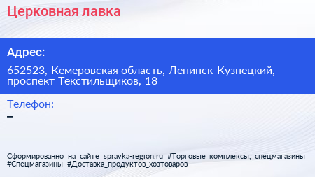 Церковная лавка по адресу 652523, Кемеровская область, Ленинск-Кузнецкий, проспект Текстильщиков, 18 в дальнейшем Организация, размещена в следующих категориях:
