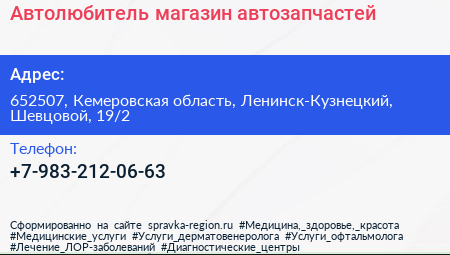 Автолюбитель, магазин автозапчастей по адресу 652507, Кемеровская область, Ленинск-Кузнецкий, Шевцовой, 19/2 в дальнейшем Организация, размещена в следующих категориях: